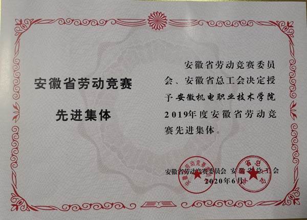 安徽机电职业技术学院喜获“安徽省劳动竞赛先进集体”荣誉称号近日,安徽省总工会、安徽省劳动竞赛委员会联合颁发表彰决定,授予安徽机电职业技术学院“安徽省劳动竞赛先进集体”称号。全省仅四所高校获此殊荣,此次评选由安徽省劳动竞赛委员会、安徽省总工会组织,旨在深入贯彻落实习近平新时代中国特色社会主义思想和党的十九大、十九届二中、三中全会精神,弘扬劳模精神和工匠精神,践行新发展理念,贯彻落实长三角一体化发展国家战略,扎实开展“当好主人翁、建功新时代”主题劳动和技能竞赛活动。