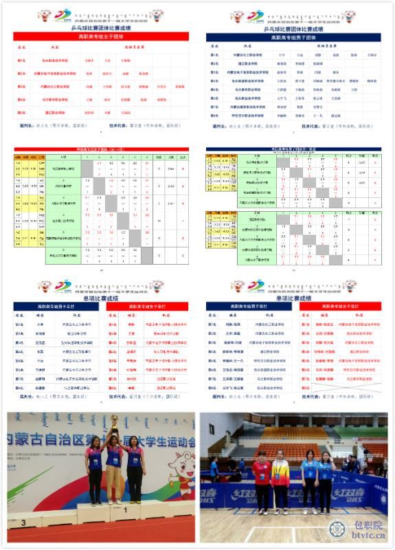 经过5天激烈的比赛,包头职业技术学院代表队在比赛中不畏强敌,坚决贯彻战术意图,勇得女子团体冠军、男子团体第六名,王艳梅/王洁获得女子双打亚军,王洁获得女子单打亚军,卫晓宇会获得女子单打第四名,云宇飞/张云勇获得男子双打第八名的成绩。