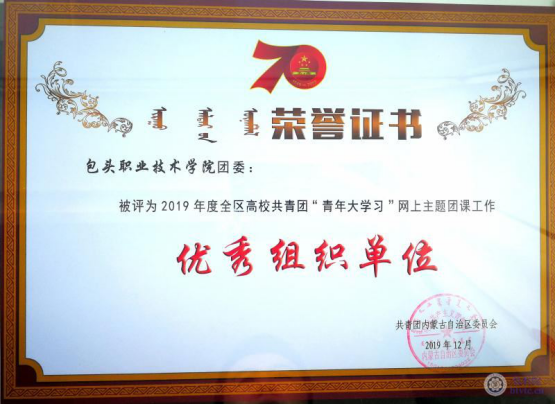在表彰大会上,包头职业技术学院共青团分别荣获了2019年度全区高校共青团“青年大学习”网上主题团课工作优秀组织单位、“千校万岗”行动2019届建档立卡贫困大学生大中专毕业生就业帮扶工作优秀组织单位、2019年度全区高校共青团“第二课堂成绩单”工作优秀组织单位、第十一届“挑战杯”全区大学生课外科技作品竞赛“优胜杯”及全区高校魅力团委书记等四项表彰,将全区共青团奖项全部收入囊中,硬核收关2019!