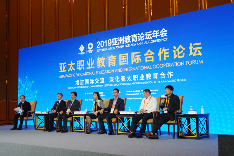 11月23日至24日,中国高等教育学会主办,亚洲教育论坛培训中心、职业教育国际合作联席会议承办的2019亚洲教育论坛年会亚太职业教育国际合作峰会在成都举行。本次年会以“智创未来,共谱亚洲教育新篇”为主题,聚焦教育质量提升、职业教育国际交流以及教育的创新发展。来自26个国家和地区的政府机构代表、国际组织代表、高职院校校长、企业代表、驻华使节等1000名代表参会。常州机电职业技术学院副校长许朝山、国际合作和交流处副处长王志松应邀参加本次年会。 亚洲教育论坛组委会公布了2019年“亚太职业院校影响力50强”评选活动获奖院校名单,并进行了隆重的颁奖仪式。常州机电职业技术学院获评“2019亚太职业院校影响力50强”荣誉称号。 许朝山代表学校上台领奖并作为受邀嘉宾发言。他介绍了常州机电职业技术学院实施“1+3+3”计划,打造高职教育国际合作品牌的做法。他表示,常州机电职业技术学院将以中国特色高水平高职学校建设为契机,聚焦智能制造核心,实现标准引领、团队领航、人才领衔、工坊领跑、技术领先、资源领先,实现更好水平、更高质量的国际化,让更多的学生知华、友华、爱华,让职业教育更好地服务国家。 本次会议积极响应国家“一带一路”倡议,通过政府、高校和社会的交流与合作,促进亚洲各国间教育交流合作深化务实,共同谱写亚洲教育改革发展的新篇章。常州机电职业技术学院将以此为契机,进一步加深与亚太地区职业教育领域的沟通与合作,积极主动融入和服务“一带一路”建设,不断探索和创新职业教育对外合作模式,为“一带一路”沿线及亚太各地区国家职业教育的发展贡献中国经验和中国标准。