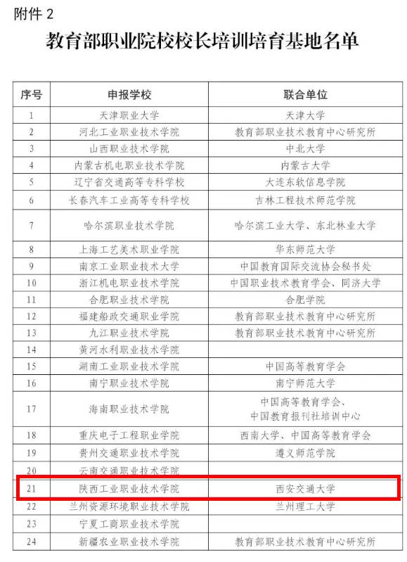 近日,教育部印发《关于公布首批职业院校校长培训基地遴选结果的通知》(教职成司函〔2020〕25号)文件,陕西工业职业技术学院被认定为教育部职业院校校长培训培育基地,是全省首批入选院校。
