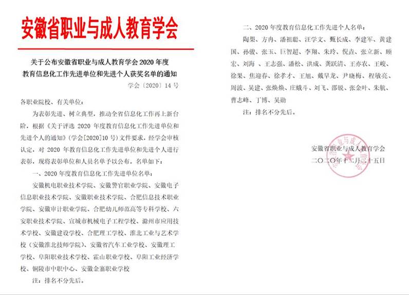 为鼓励先进,发挥典型示范效应,进一步推动我省教育信息化工作,安徽省职业与成人教育学会于2020年10-12月开展了2020年度教育信息化工作先进单位和先进个人的评选工作。我校在2020年教育信息化工作中,认真贯彻落实《职业院校数字校园建设规范》,积极推进职业院校数字校园实验校建设,结合高职创新发展行动计划和“双高计划”建设,围绕智慧校园建设做好顶层设计规划、综合协调实施、高效推进系统应用。学校通过改善校园网基础设施,夯实校园网公共基础设施服务平台;打造优质在线课程平台,建设“机电云教育”平台;推进业务平台建设与数据融通,构建系统化管理服务平台;实现数据源头采集,建设面向教学诊改的大数据决策分析系统;开展信息技术应用培训,提高教师信息化应用能力,稳步推进智慧校园建设。日前,从安徽省职业与成人教育学会网站获悉,我校获2020年度教育信息化工作先进用户单位荣誉称号,汪学文同志获2020年度教育信息化工作先进个人荣誉称号。