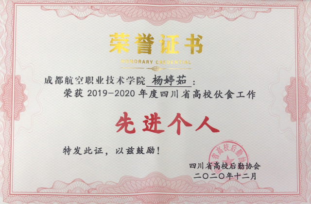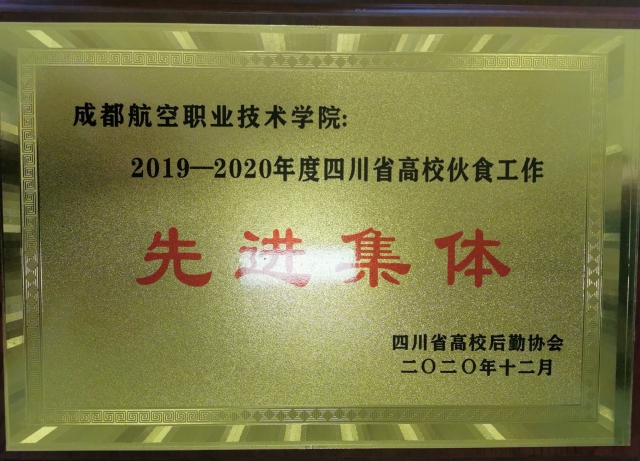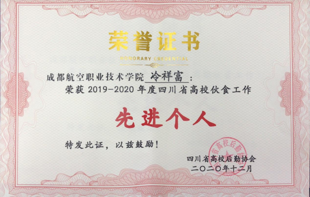 会议表彰了2019-2020年度高校伙食工作先进集体和先进个人。成都航空职业技术学院被评为四川省高校后勤协会高校伙食工作先进集体,我校后勤服务总公司饮食服务中心杨婷茹、冷祥富两位同志荣获高校伙食工作“先进个人”称号。