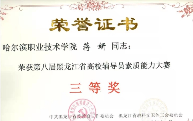 本次比赛共有4个环节,分初赛、决赛两个阶段进行。初赛包括笔试(基础知识测试)和案例研讨两个环节,决赛包括宣讲对谈和谈心谈话两个环节,对参赛选手的理论水平、专业素养以及解决实际问题的能力进行全方位、多角度考察。经过初赛选拔,共有20名辅导员晋级决赛。在决赛中,蒋妍结合工作实际与自身育人经历展开宣讲对谈与谈心谈话,展示了我院辅 导员过硬的工作能力,获得第八届黑龙江省高校辅导员素质能力大赛三等奖。