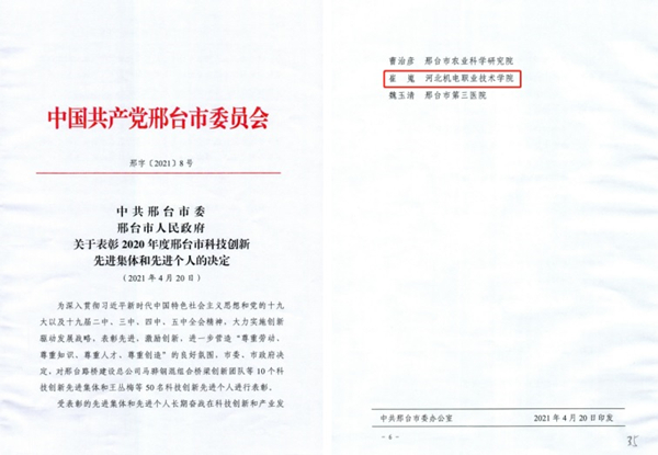 近日,从中共邢台市委、邢台市人民政府获悉,我院高职研究所崔嵬老师被授予2020年度“邢台市科技创新先进个人”荣誉称号。全市共有50人获此殊荣。