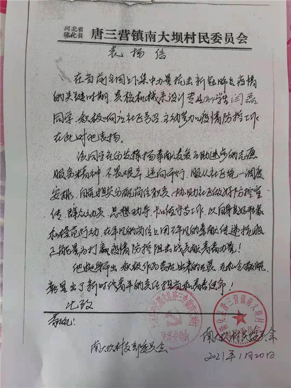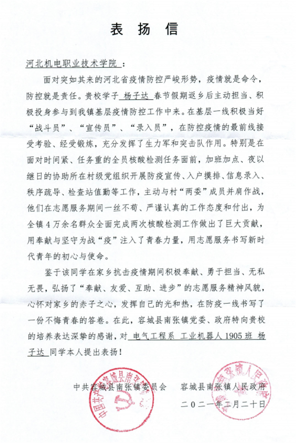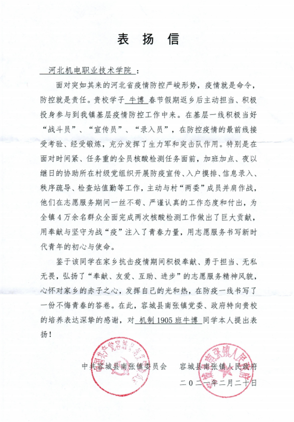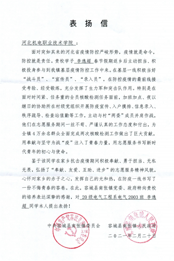 在新冠状病毒肺炎疫情防控阻击战中,寒假期间居家的机电大学生们纷纷挺身而出,积极加入社区疫情防控志愿服务队伍,机电志愿者们不顾个人安危、不畏艰难险阻、主动坚守在防控一线,成为各地疫情防控线的最美风景线。近日,学院陆续收到来自中共容城县南张镇委员会、容城县南张镇人民政府、唐三营镇南大坝村委会等多个基层单位的表扬信和感谢信,各单位纷纷对机电大学生踊跃投身家乡疫情防控志愿服务的行为表示肯定和感谢。