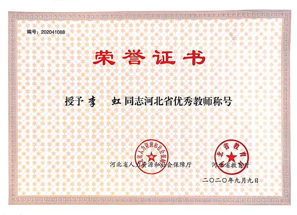 近日,河北省人力资源和社会保障厅、河北省教育厅正式下发证书,授予马克思主义学院教师李虹副教授河北省优秀教师称号。