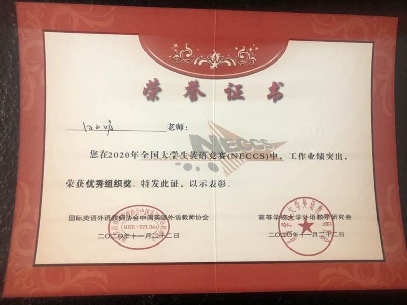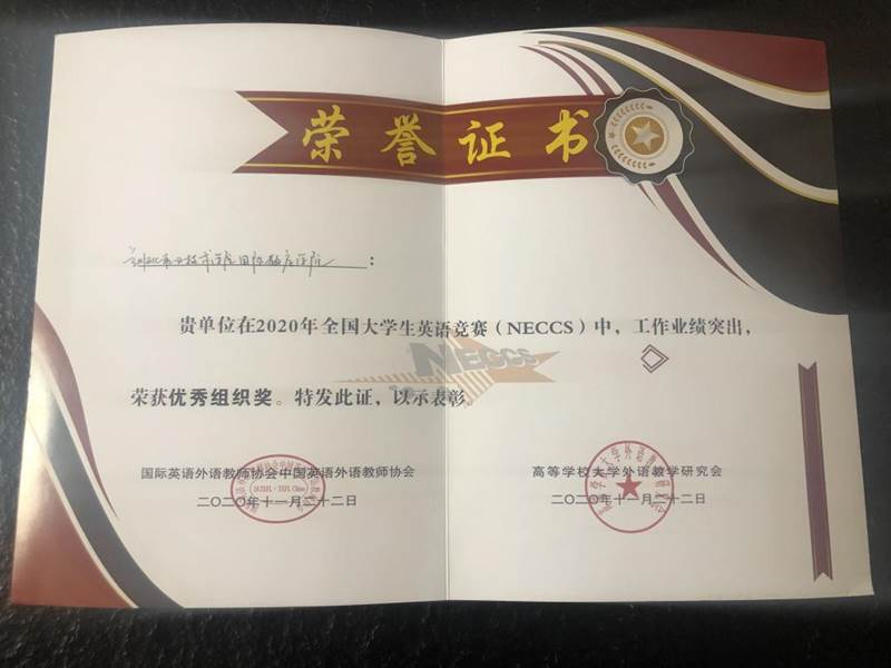 近日,由高等学校大学外语教学研究会、国际英语外语教师协会中国英语外语教师协会主办的“2020年全国大学生英语竞赛”决赛在兰州大学落下帷幕,来自全省的本专科院校选手同台竞技,我校选派初赛成绩优异的应用化学工程学院袁窦千艺、印刷出版工程学院王强、石油化学工程学院刘振兴三名选手(指导教师毛建梅、田玉娟、王晓云)代表我校参赛,经过激烈角逐,三位选手均获得国家级一等奖。我校国际教育学院及负责老师田玉娟分获“优秀组织奖”。