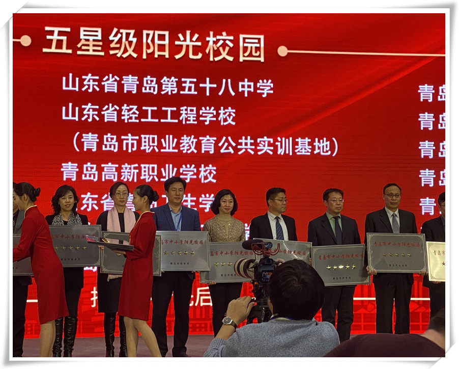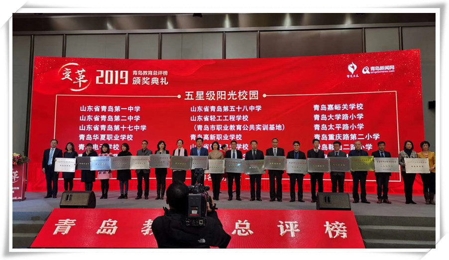 为广泛宣传弘扬先进典型事迹,凝聚教育正能量,进一步激励全市教育工作者干事创业的积极性,2020年1月13日,中共青岛市委宣传部、青岛市精神文明建设委员会办公室、中共青岛市委教育工委、青岛市教育局在青岛国际会议中心举行2019教育总评榜颁奖典礼,对2019年青岛教育系统“阳光校园”等多项荣誉进行隆重表彰。山东省轻工工程学校(青岛市职业教育公共实训基地)荣膺“2019年青岛市中小学阳光校园(五星)”“第五届青岛市教育改革创新奖”两项大奖。山东省轻工工程学校党委书记孙一志、青岛市职业教育公共实训基地副主任李祥新代表学校(基地)上台领奖。