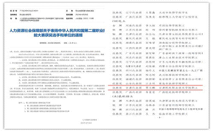 近日,人力资源社会保障部发布了《关于表扬中华人民共和国第二届职业技能大赛获奖选手和单位的通报》。其中,我校教师贾文鹏获得电工赛项优胜奖。