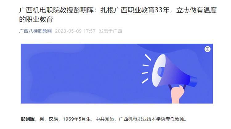 我校交通工程学院院长彭朝晖教授,他深耕职业教育沃土,立志做有温度的职业教育,工作成效卓著。他是二级教授,硕士生导师,广西师范大学客座教授。先后获国家级教学名师、国家级教学团队带头人、国家级精品课程负责人、自治区优秀专家、全国交通职业院校优秀专业带头人、交通运输部优秀教师、广西“八桂名师”、南宁市“特聘专家”等荣誉称号。2023年5月9日,广西八桂职教网以《广西机电职院教授彭朝晖:扎根广西职业教育33年,立志做有温度的职业教育》为题报道了他的事迹。全文如下:
