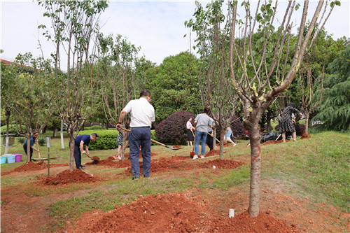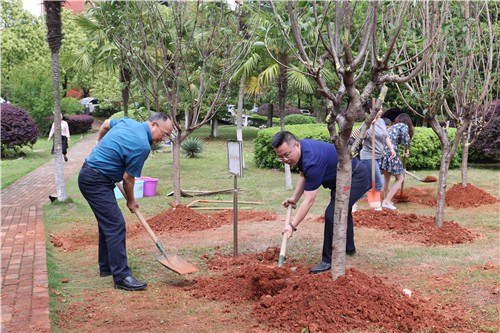 在植树现场,参加活动的党员同志分工协作、配合默契,扶苗、挥锹、培土、浇水……在英才园蜿蜒小路两旁共栽种樱花树10余棵,打造“廉政先锋林”,为校园增绿添彩。