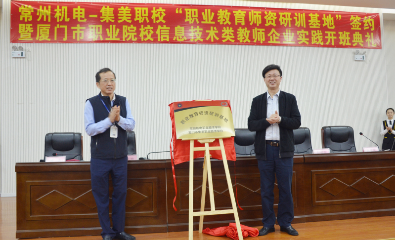 3月29日上午,常州机电-厦门集美“职业教育师资研训基地”签约仪式暨厦门市职业院校教师素质提高计划信息技术企业实践项目开班典礼在厦门市集美职业技术学校召开。厦门市教育科学院职教教研室主任、厦门市国培办副主任曾志斌,厦门市集美职业技术学校党总支书记、校长杜志忠,我校党委书记曹根基出席,厦门市教育科学院、厦门集美职校和我校相关部门负责人,培训项目协办企业领导、培训项目负责人、工作人员及参训学员60余人参加了典礼。典礼由我校继续教育学院院长姚宏主持。