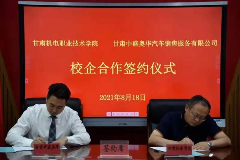 在全体参会人员的共同见证下,学院党委委员、副院长张德龙与甘肃中盛奥华汽车销售服务有限公司总经理张宏伟签署了校企共建合作协议,学院党委委员、副院长毛文辉与甘肃中盛奥华汽车销售服务有限公司总经理张宏伟签署了实训基地建设协议。