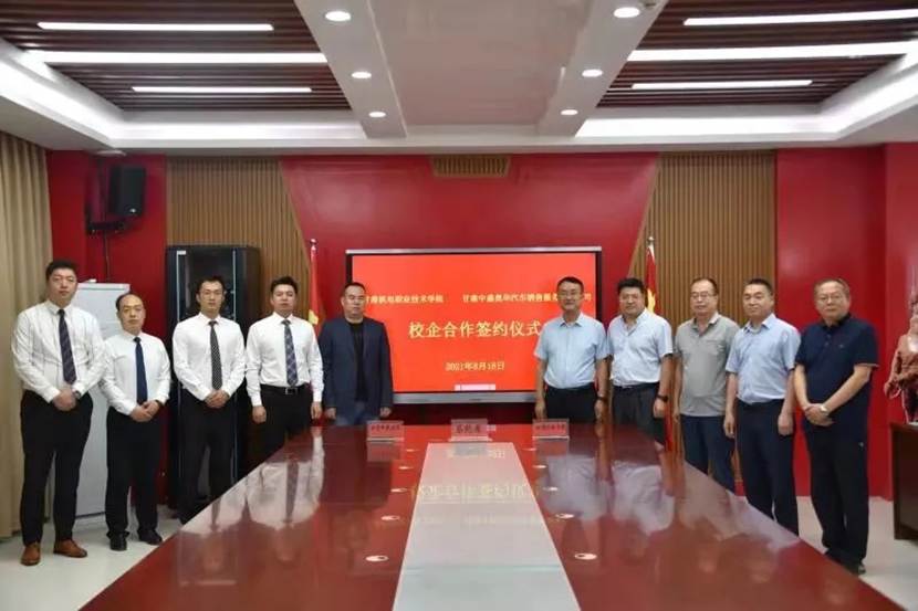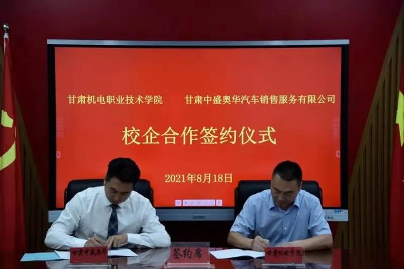8月18日上午,学院与甘肃中盛奥华汽车销售服务有限公司在综合办公楼三楼会议室举行校企合作共建产教融合汽车实训基地签约仪式。甘肃中盛鹏泽集团董事长吴云泽、甘肃中盛奥华汽车销售服务有限公司总经理张宏伟,在家院领导坚葆林、李自勇、张德龙、毛文辉及相关部门负责人出席签约仪式。签约仪式由学院党委副书记、院长赵彦军主持。