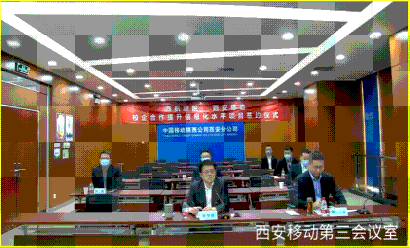 经过多轮谈判和沟通,3月10日上午10点30分,我校与中国移动西安分公司在五号教学楼智慧教室举行“校企合作提升信息化水平项目”线上签约仪式。中国移动西安分公司党委书记、总经理张宇锋,党委委员、副总经理冯海强,副总经理第五江峰,我校校长张敏华,党委副书记王宏斌,副校长侯晓方,以及中国移动西安分公司市场经营部、政企客户部、阎良分公司的相关领导,我校现代教育技术中心老师出席会议。仪式由现代教育技术中心主任李永锋主持。