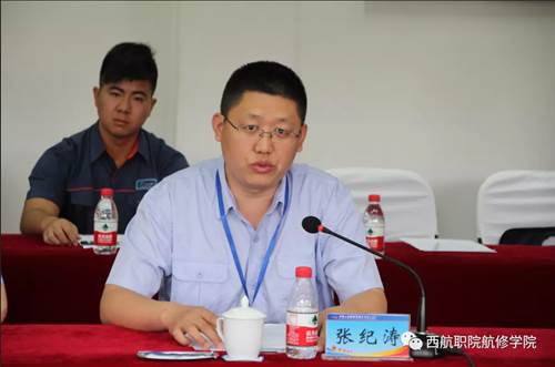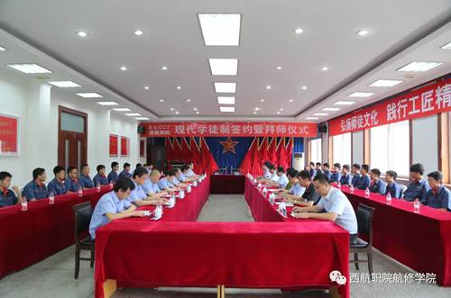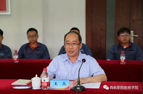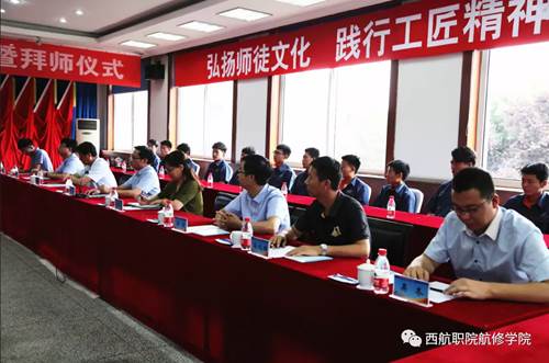 会议由5702厂培训中心主任张纪涛主持召开,参会人员有西安航空职业技术学院党委书记周岩、党委副书记车美娟、宣传部部长刘增铁、校企合作处处长王波、航空维修工程学院副院长石日昕、副书记高北雄、学生管理办公室主任石鑫、飞机机电设备维修教研室主任吴冬。5702厂领导有党委书记王兵、党建人力部主任黄涛、党建人力部书记韩晶、培训中心主任张纪涛、党建人力部工时定额主任龙华江。5702厂高级技师李平、周卫、叶牛牛以及西安航空职业技术学院航空维修工程学院2017级5702订单班全体学生参加了本次拜师仪式。