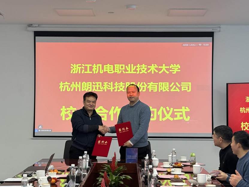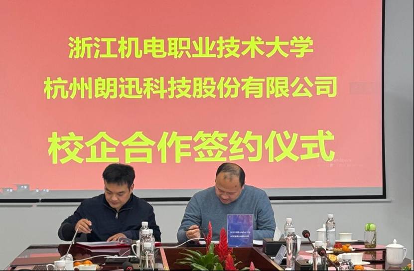 随后,在与会嘉宾和师生的共同见证下,学校与杭州朗迅科技股份有限公司共同签署了校企合作协议书。