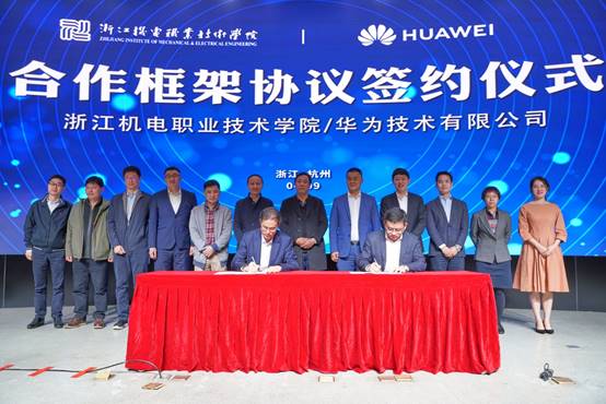 4月9日上午,浙江机电职业技术学院与华为技术有限公司正式签署合作框架协议,标志着双方正式进入深度产教研合作新阶段。浙江机电学院党委书记黄道平,院长丁金昌,党委委员丁明军,科技开发处处长陈云祥,现代信息技术学院院长卢涤非,党总支书记任峰,副院长江洪,华为中国政企教育业务部部长曾伟经,华为浙江政企业务部副总经理张夷,华为浙江政企业务部杭州市总经理赵环宇,华为浙江政企业务部教育行业总经理曹阳等出席了签约仪式。